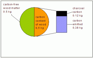 Fig 5. Carbon content of wood and its split into two compartments: charcoal and emissions. The efficiency of charcoaling in this example is 13 %, carbon content of charcoal 90%.